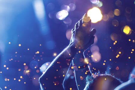 Vintage style photo of a crowd, happy people enjoying rock concert, raised up hands and clapping of pleasure, active night life concept