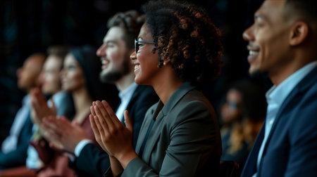 Audience members are enthusiastically clapping, showing appreciation and giving an ovation for a performance or successful event, celebrating with unified support in a dimmed setting