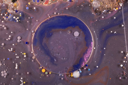 Paint splatter. Glitter bubbles. Defocused purple blue color sparkling round oil texture mix acrylic splash on abstract art background.