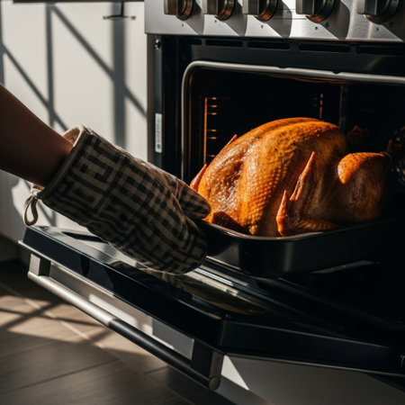 Over-the-shoulder view of a golden brown roasted turkey being pulled from a hot oven in harsh sunlig