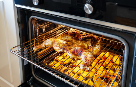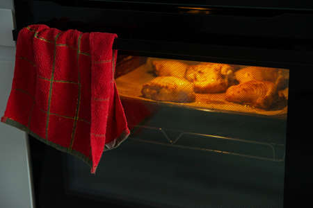 Oven temperature for cooking in a new gas oven. Chicken baked in the oven in a glass pan. Homemade food.