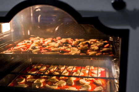 Cooking pizza at home. Details of fresh pizza in the oven