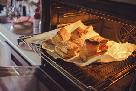 Pastries from puff pastry in the oven in the kitchen.