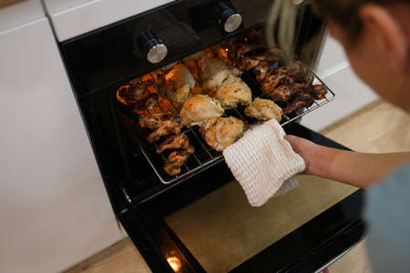 Woman cook taking out baked chicken from oven on baking sheet closeup