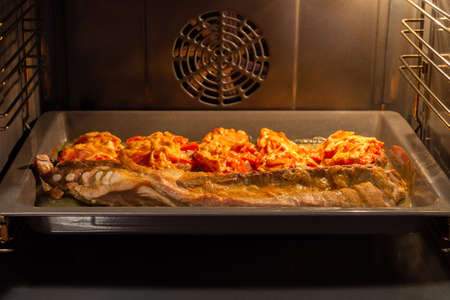 meat baked in the oven in a pan close-up, pork tenderloin, tomato and cheese, kitchen