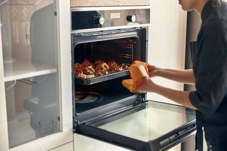 Cropped view of woman hand open door built in oven equipment, standing near kitchen appliance in modern interior house, baking food
