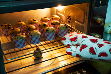 Close-up muffins ready to get out of electric oven. Concept of cooking home cake. Tasty food.