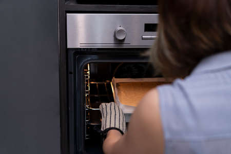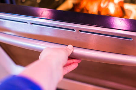 Closeup of womans hands open the oven. Housewife includes a built-in oven. unrecognizable girl is cooking pastries.