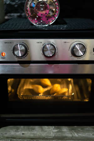 Air Fryer oven cooking food. Black Modern Electric Deep. Domestic Household & Small Kitchen Appliances.