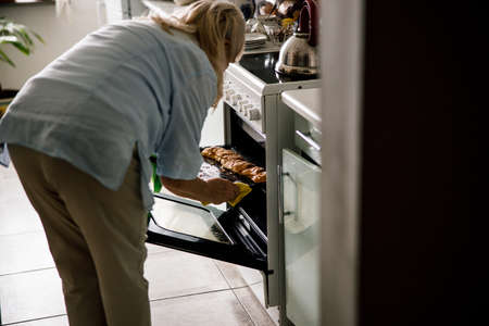 Woman hand with a protective glove takes out of the oven baked rolls. The process of preparing homemade rolls pastry. Domestic and hand made food preparation concept. Close up, selective focus
