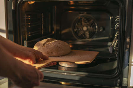 Woman hand with a protective glove takes out of the oven baked rolls. The process of preparing homemade rolls pastry. Domestic and hand made food preparation concept. Close up, selective focus