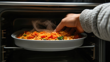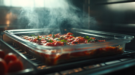 Steam wafts upward from a heated frozen dinner, highlighting the warm dish and the atmosphere of cooking, creating an inviting, cozy environment.