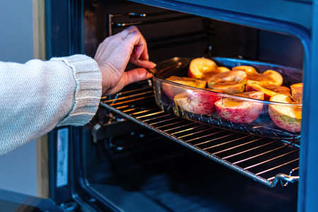 glass container with sliced stuffed apples in the oven, close-up, homemade dessert concept