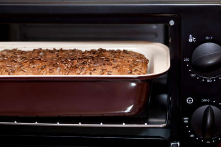 Housewife prepares cake in kitchen. Homemade cake baking in oven