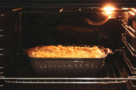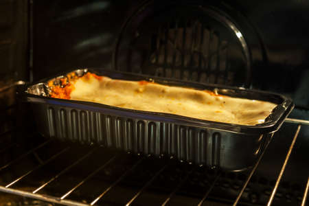 the lasagna is baked in the oven. Cooking a delicious homemade dinner