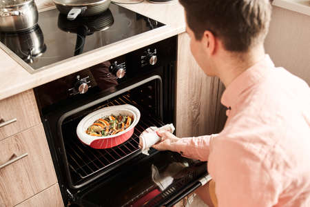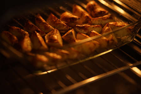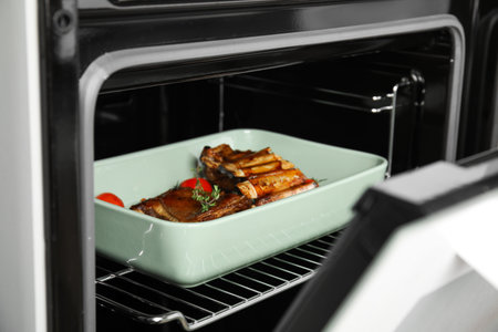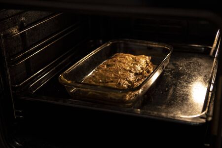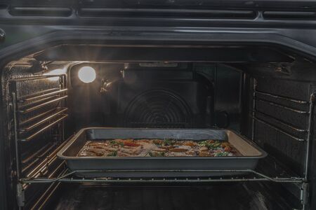 Oven temperature for cooking in a new gas oven. Chicken baked in the oven in a glass pan. Homemade food.