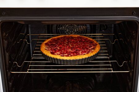 Homemade raspberry pie with yogurt filling cooked in the domestic oven. Shallow focus.