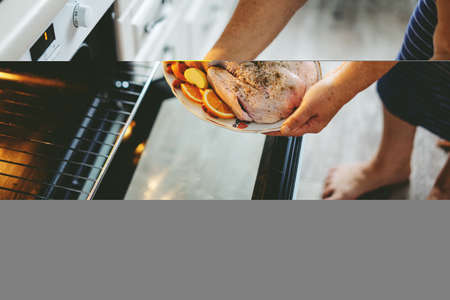 Woman cooking christmas duck puting raw duck with vegetables in oven. Cooking process.
