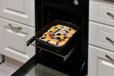 Plum Pie in the oven. Homemade biscuit fruit cake