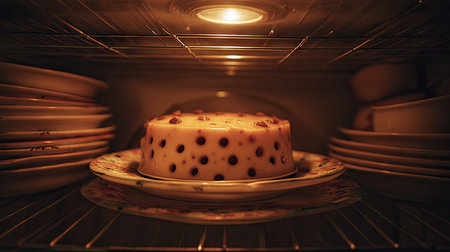 apple pie baking in a cozy, warmly lit oven, created with generative ai