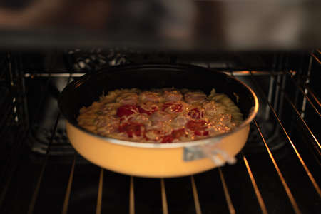 Homemade pizza with sausages, tomatoes and cheese in hot air oven close up with selective focus. Process of cooking pizza, step 11