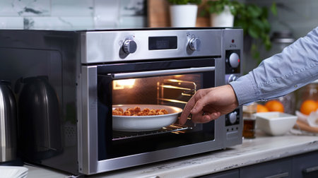 Woman opening glass door in electric oven with light inside. Housewife using empty microwave with a metal grid. Kitchen with built in household appliance, baking equipment