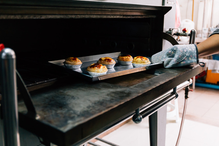 Freshly chiffon cake on baking trays in the oven. homemade bake,Selective focus