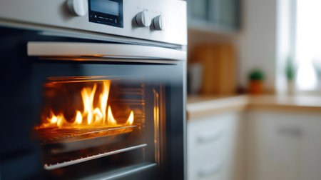 A closeup shot of a modern oven with a burning fire inside