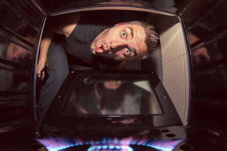 The man looks in a lit oven
