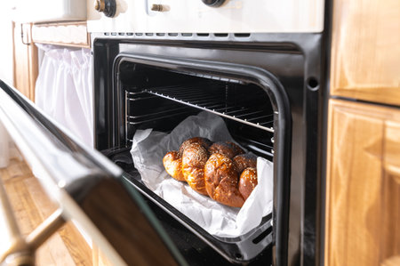 selected focus on fresh homemade bread loaf on baking tray in electric oven with open door. home cooking concept. modern household appliances at kitchen