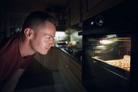 Man watching dough in electric oven during baking Christmas cookies at home kitchen.
