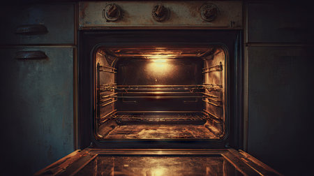 oven with warm glow and steam escaping, ready for baking or roasting, created with generative ai