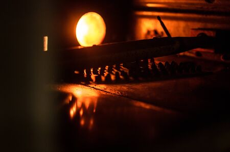 View into the oven on the baking tray for meatballs. Little light, light only from the oven. Shallow depth of field, blurred background.