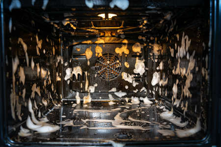cleaning a dirty oven in the kitchen.