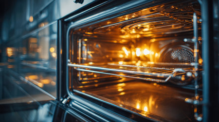 An open oven interior features an empty rack and radiant lighting. The image emphasizes the warm, inviting glow emanating from inside. The composition suggests a focused view of the oven's interior, suitable for illustrating cooking processes or concepts. This image could be used for various commercial or editorial purposes.