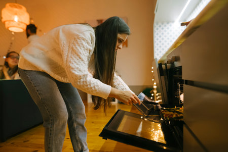 Closeup of womans hands open the oven. Housewife includes a built-in oven. unrecognizable girl is cooking pastries.