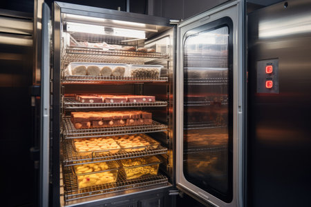 temperature-controlled holding cabinet with a variety of food items in the background, created with generative ai