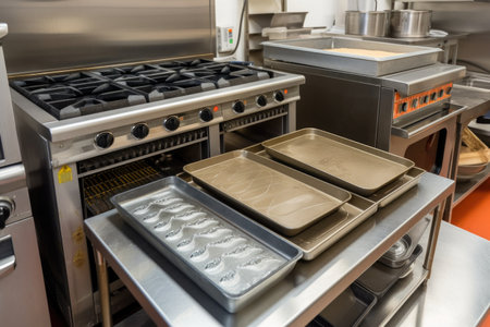 oven and range with baking trays and mixers, ready for baking, created with generative ai