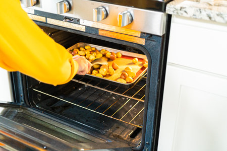 In a modern kitchen, an array of halved, multicolored marble potatoes are arranged on a baking pan lined with a silicone liner. The roasting process infuses the kitchen with a mouthwatering aroma, indicating a delicious side dish in the making.