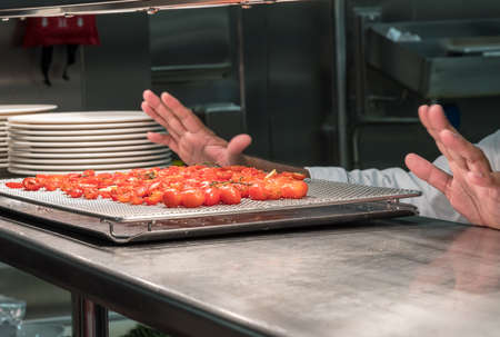 Chef preparing grilled tomatoes in commercial stainless steel kitchen in restaurant