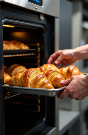 Professional baker taking a tray of perfect golden brown croissants out of a commercial oven in a bakery, filling the air with delicious aroma