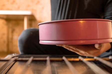 A man puts a baking dish in the oven. Hight quality photo. Form of pink color of pastel shade. Taken from inside the oven. A nice warm light falls on the shape and hands of the person.