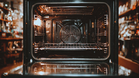 An open oven interior is the main subject. The image displays the interior structure featuring racks and a prominent fan. Warm lighting creates a sense of depth and the background hints at an indoor environment. Suitable for illustrations related to cooking, appliances, or home design for various uses.