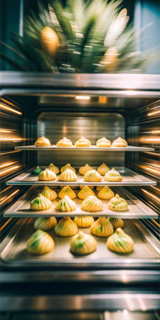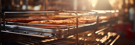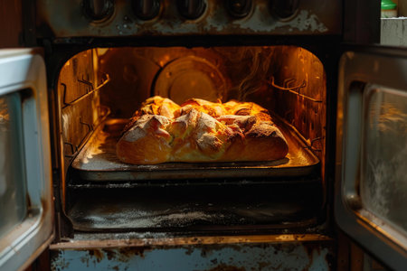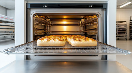 A Freshly baked bread in industrial oven, warm and inviting