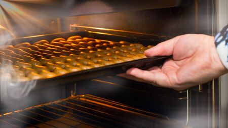 Detail of person putting a tray of cookies in the oven. Close up. Cropped image.