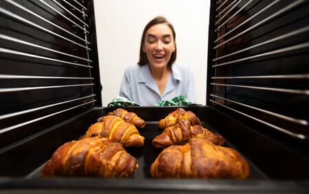 Fresh baking. Cheerful woman taking delicious crispy croissants from oven, view from inside
