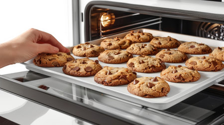 Freshly baked chocolate chip cookies on a baking tray in the oven