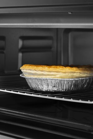 Steak and ale pie cooked in an electric oven grill in foil dish. With selective colour