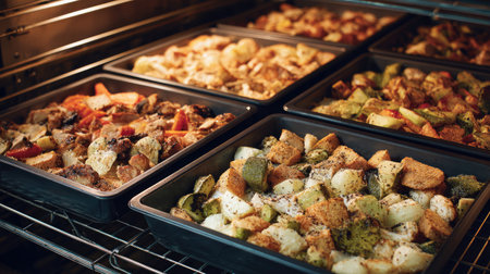 Industrial oven baking components of ready-to-eat meals in large trays for mass production