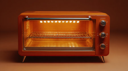 This vintage retro orange toaster oven features a glossy finish and warm interior light, making it a stylish and functional addition to any modern kitchen.